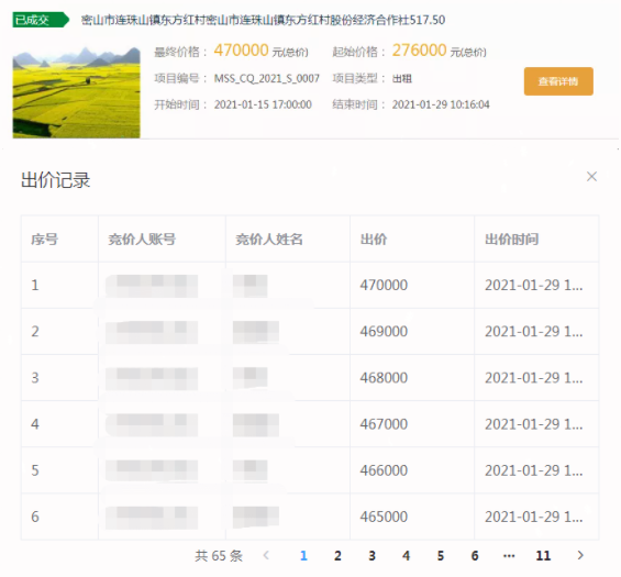 其中一宗517畝耕地,掛牌底價為27.6萬元,經(jīng)過65輪次競價,最終以47萬元成交,成交溢價19.4萬元,平均每畝地給村集體帶來375元增值收益。