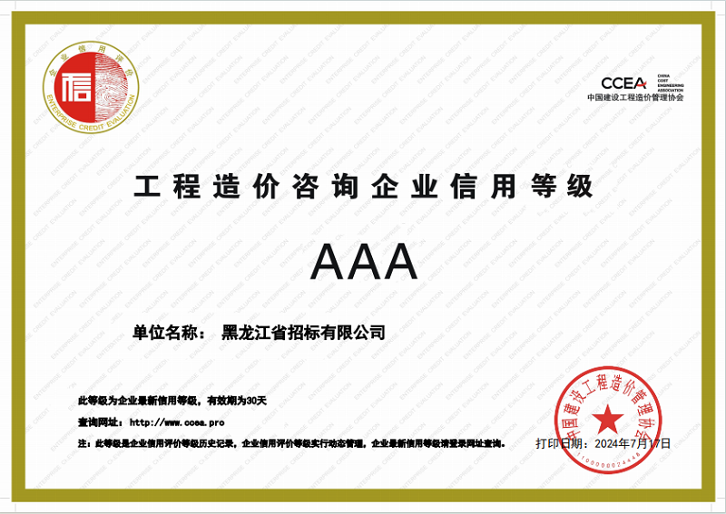 日前,中國建設(shè)工程造價管理協(xié)會發(fā)布了2024年第一批工程造價咨詢企業(yè)信用評價結(jié)果,黑龍江省招標有限公司憑借專業(yè)的實力、優(yōu)質(zhì)的服務(wù)和良好的企業(yè)信譽,榮獲了“工程造價咨詢企業(yè)AAA級”信用評價。