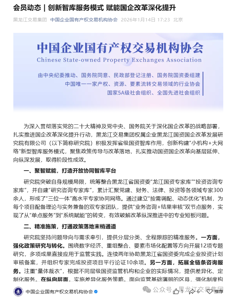 為深入貫徹落實黨的二十大精神及黨中央、國務(wù)院關(guān)于深化國企改革的戰(zhàn)略部署,扎實推進(jìn)國企改革深化提升行動,黑龍江交易集團(tuán)權(quán)屬企業(yè)黑龍江國資國企改革發(fā)展研究院有限公司(以下簡稱研究院)積極發(fā)揮省級國資智庫作用,創(chuàng)新構(gòu)建“小機(jī)構(gòu)+大網(wǎng)絡(luò)”新型智庫服務(wù)模式,聚焦政策傳導(dǎo)與改革落地,扎實推動國資國企改革向基層延伸、向縱深發(fā)展,取得階段性成效。